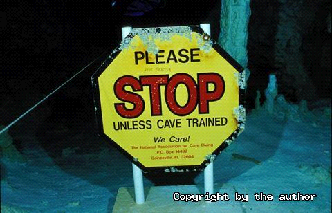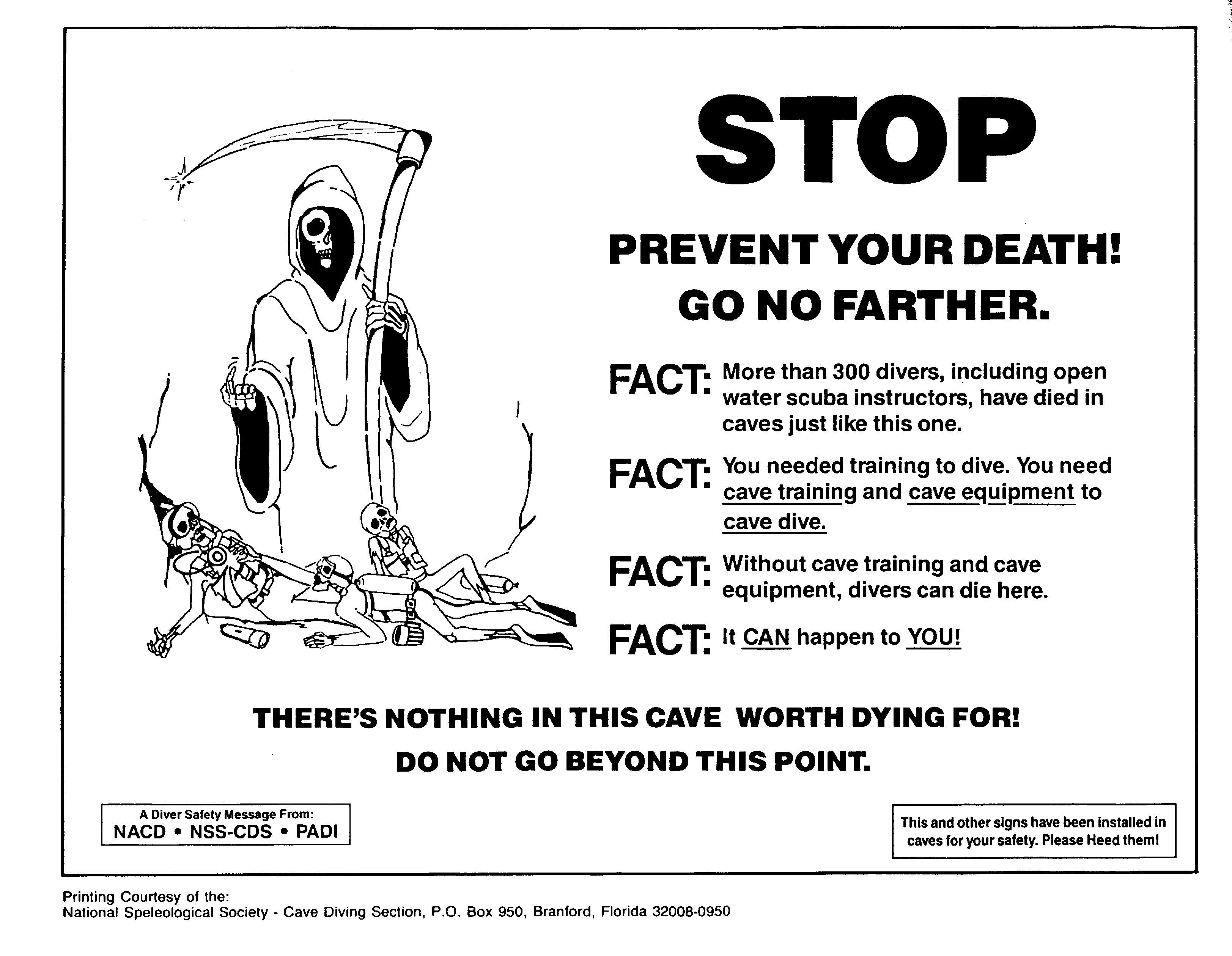 | AVVERTIMENTO: Al subacqueo che si immerge in grotta è richiesta un’attrezzatura specifica, oltre che a stabilità e tranquillità mentale, essendo questa specialità altamente tecnica. Il normale addestramento in acqua libera non è sufficiente per risolvere eventuali problemi in grotta. Molti incidenti sono accaduti perché l’improvvisato speleosub ha pensato “entro solo a dare un’occhiatina”. |